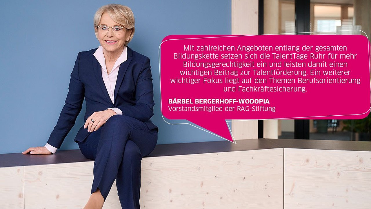 Seit 2014 begleiten die TalentTage Ruhr Kinder und Jugendliche auf ihrem Bildungsweg und unterstützen sie durch vielfältige Angebote dabei, ihre Stärken zu entdecken und eine berufliche Perspektive zu entwickeln. Das Programm umfasst kostenfreie Workshops, Exkursionen, Unternehmensbesuche sowie Beratungsangebote und Informationsveranstaltungen. Seit 2017 ist die RAG-Stiftung Hauptförderer der TalentTage Ruhr und setzt die langjährige Förderung auch im Jahr 2024 fort. „Im Ruhrgebiet leben viele Kinder und Jugendliche mit ganz individuellen Talenten. Nicht alle von ihnen können ihre Fähigkeiten entfalten. Genau hier setzen die TalentTage Ruhr an: Mit zahlreichen Angeboten entlang der gesamten Bildungskette setzt sich die Initiative für mehr Bildungsgerechtigkeit ein und leistet damit einen wichtigen Beitrag zur Talentförderung. Ein weiterer wichtiger Fokus liegt auf den Themen Berufsorientierung und Fachkräftesicherung“, sagt Bärbel Bergerhoff-Wodopia, Mitglied im Vorstand der RAG-Stiftung und Bildungsbeauftragte des Initiativkreises Ruhr. „Die TalentMetropole Ruhr ist mittlerweile eine starke, eigenständige Marke. Nun gilt es, diese Marke auf Basis der wissenschaftlichen Evaluationen weiterzuentwickeln. Damit die Qualität auch dauerhaft stimmt!“